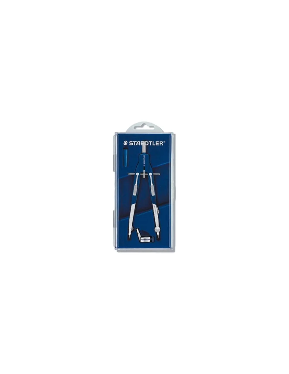 Compás de precisión con rueda central y mecanismo de ajuste rápido mediante teclas, diámetro máximo del círculo 350 mm y con alargadera 585 mm. Estuche de plástico con tapa transparente con: compás con patillas, tubo de minas y adaptador universal de rosca.