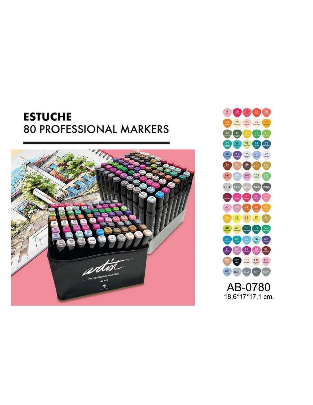 Rotuladores de 2 puntas y tinta translúcida con base de alcohol que permite una óptima mezcla de colores. Indicados para relenar dibujos, caligrafia, lettering y punta fina para dibujo artístico, comics, etc. Estuche 80 unidades. Tamaño: 18,6x17x17,1 cm.